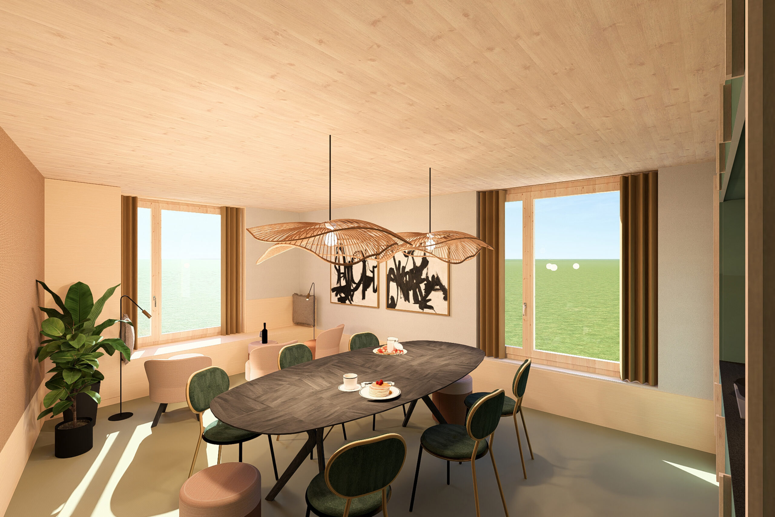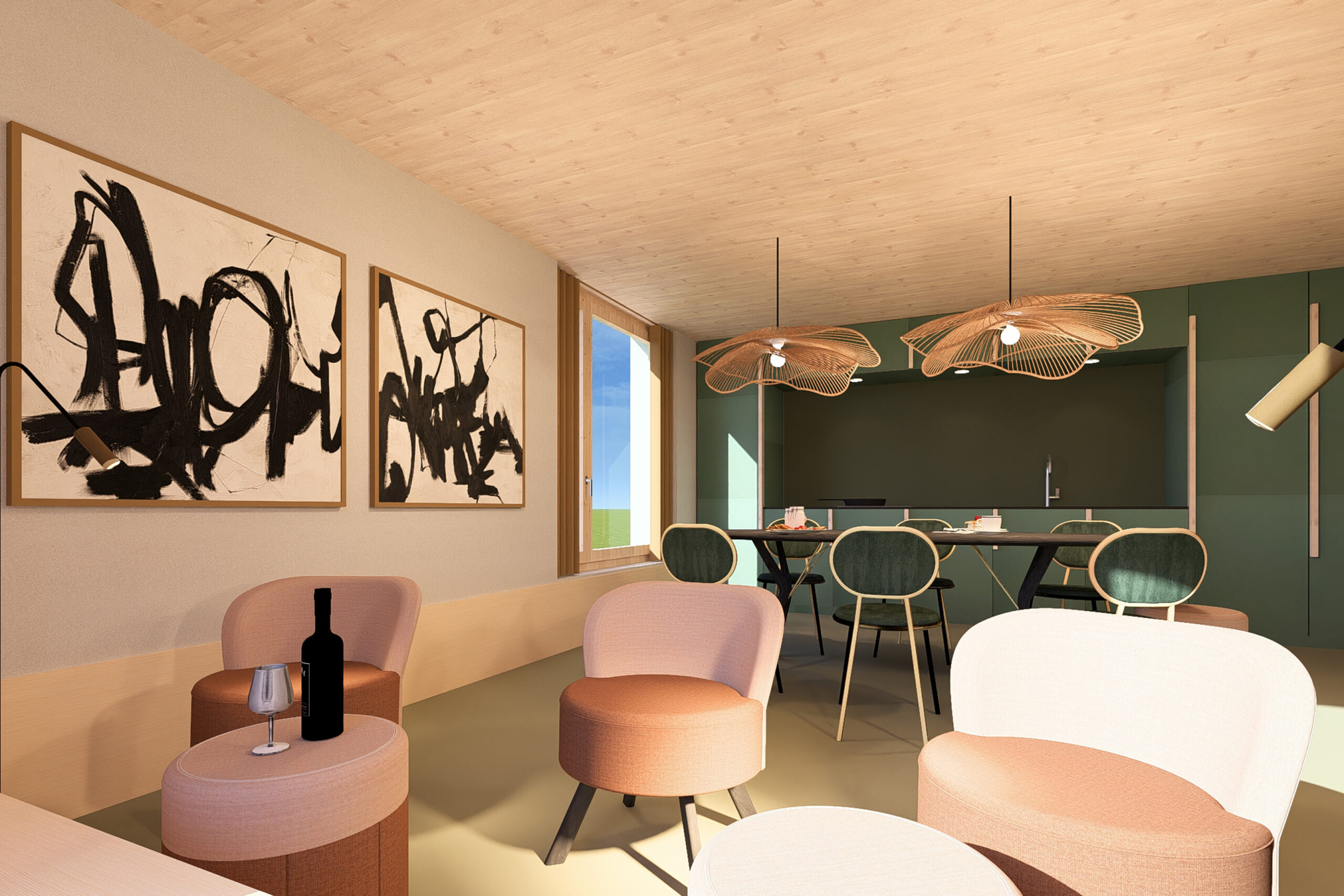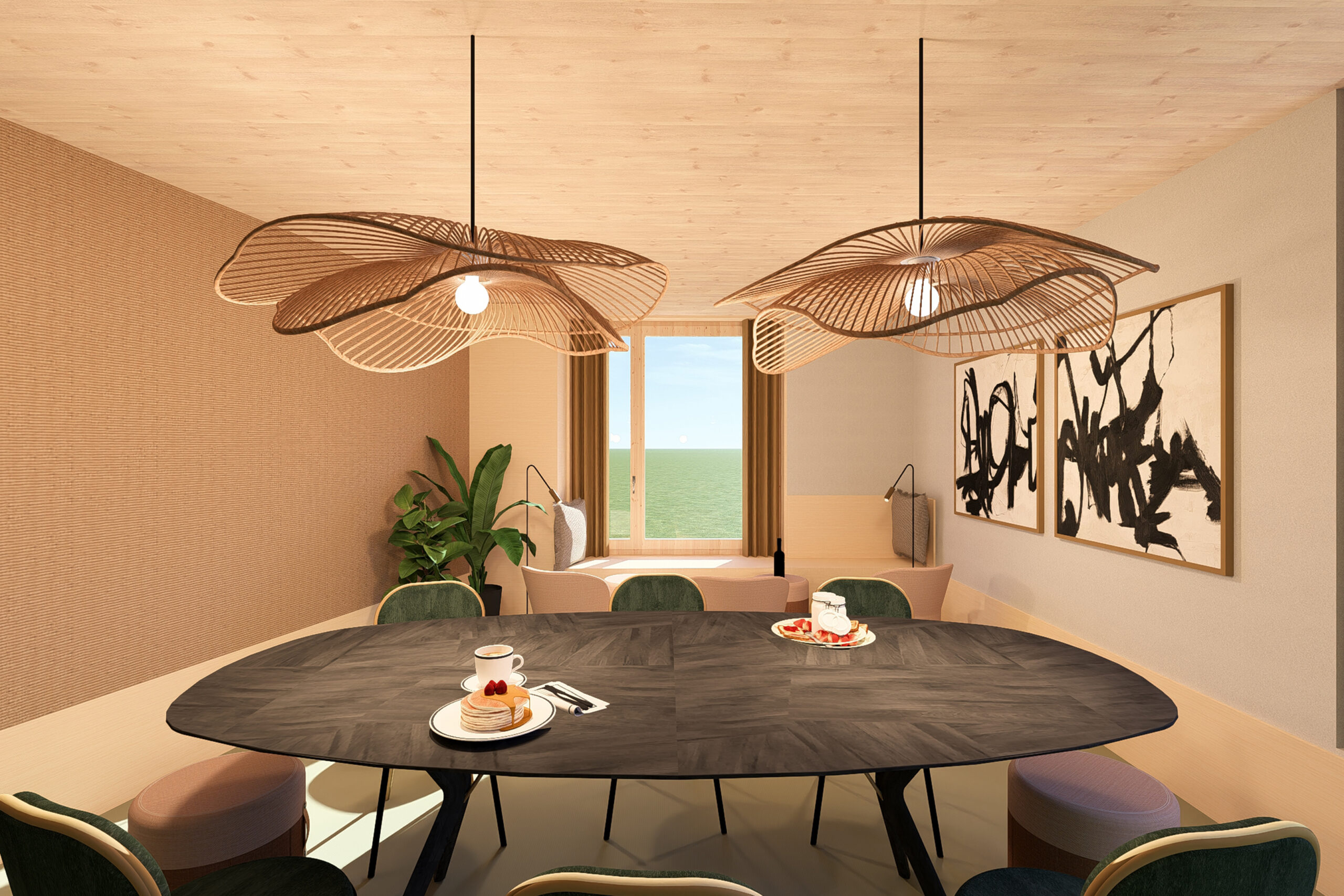 Stylisches Interieur: Naturholzdecken, stimmungsvolle Pendelleuchten, stilvolle Kunstwerke
