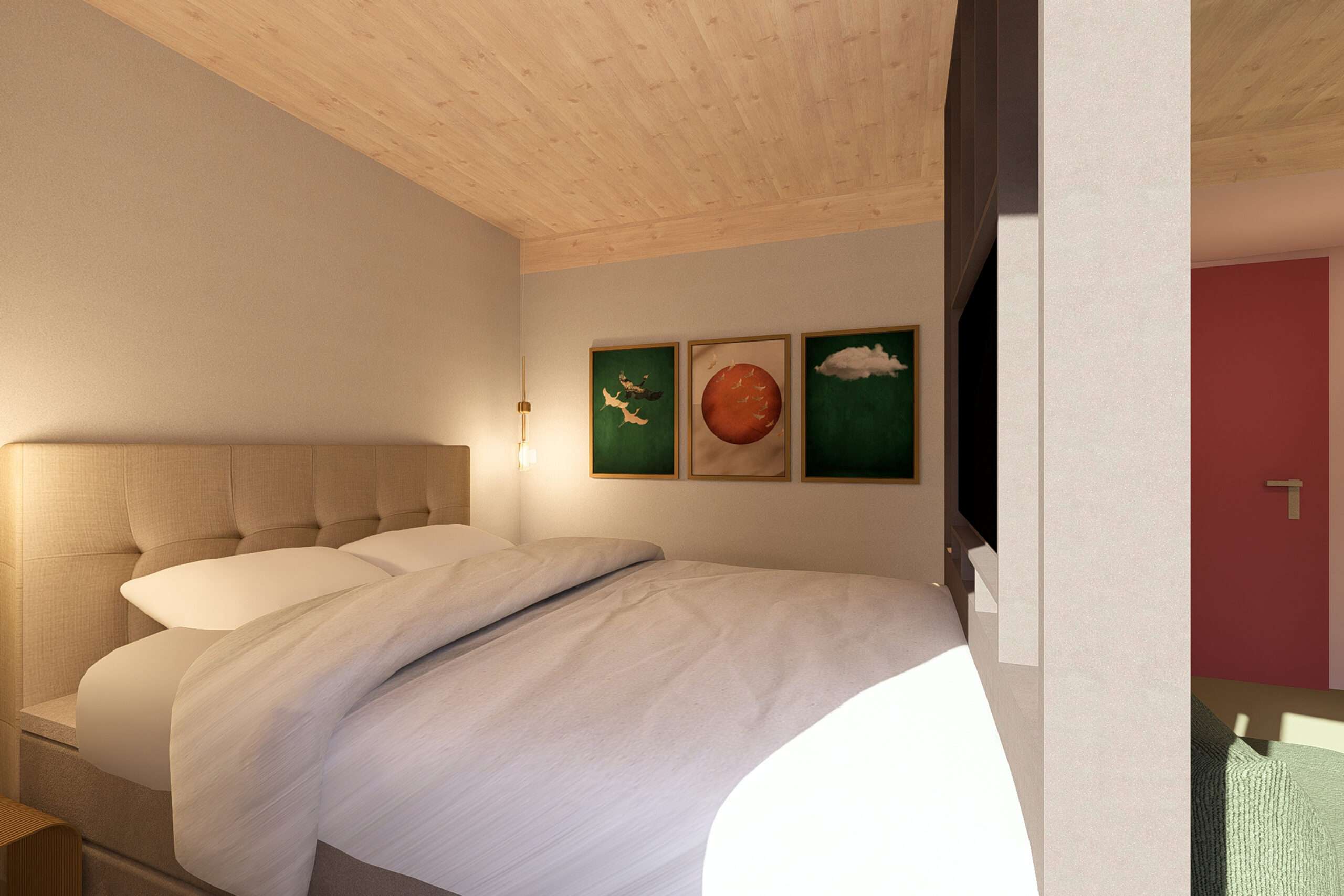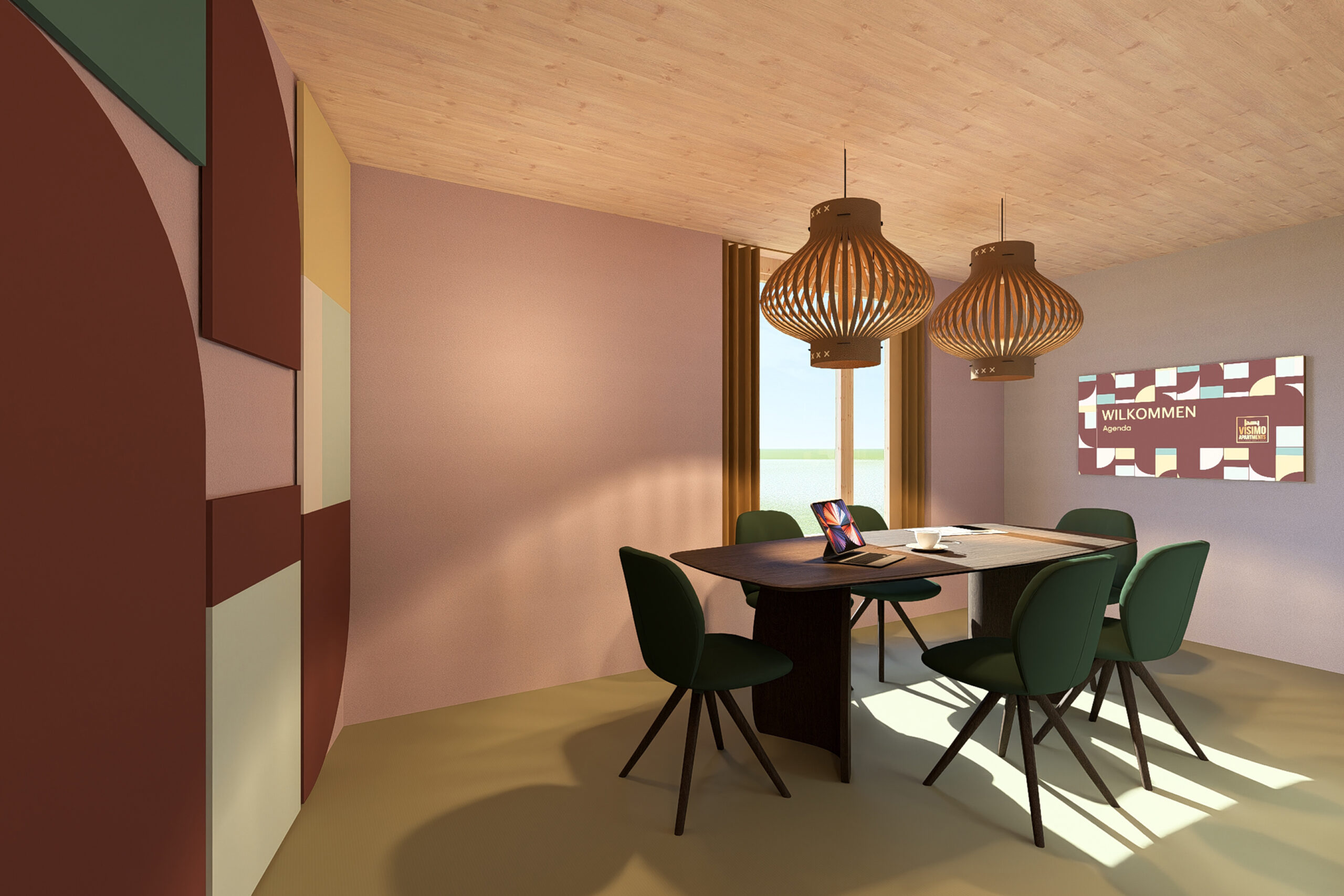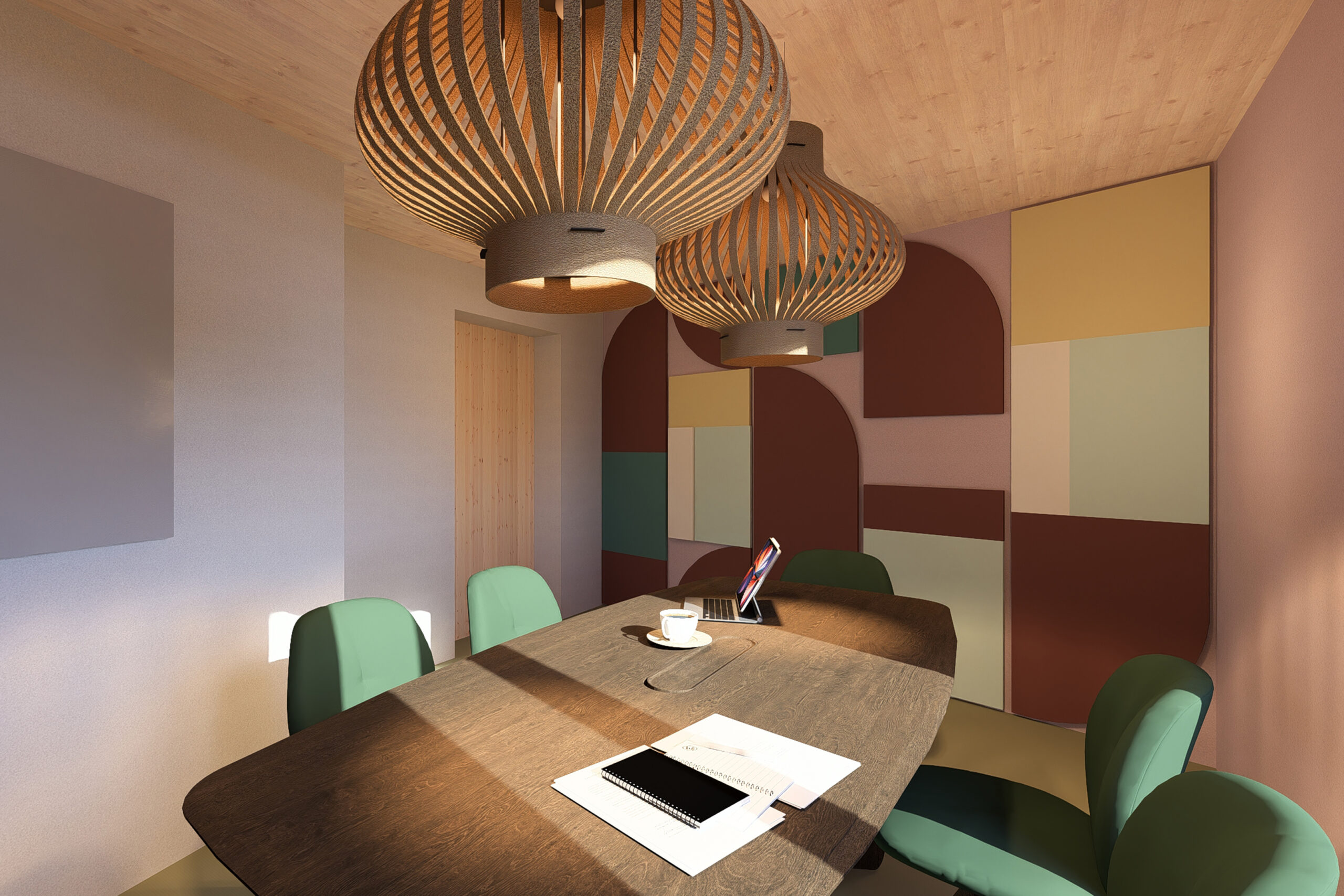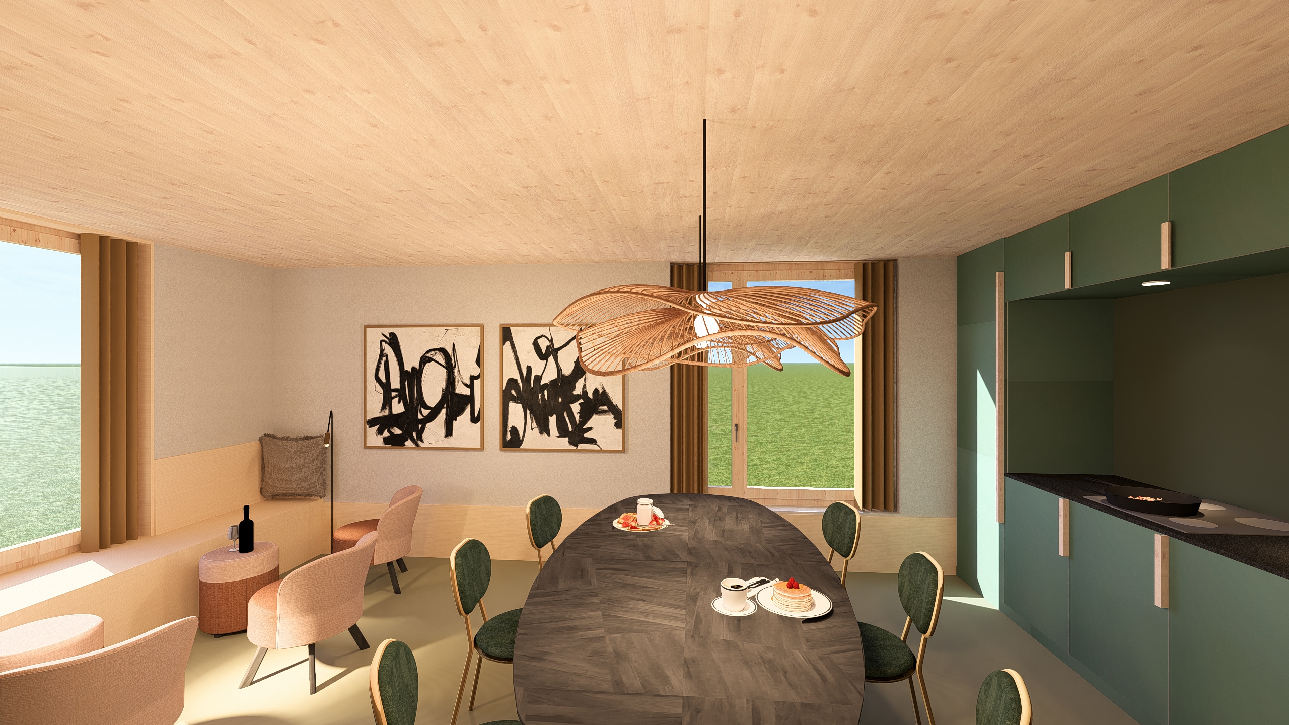 Stylisches Interieur: Naturholzdecken, stimmungsvolle Pendelleuchten, stilvolle Kunstwerke